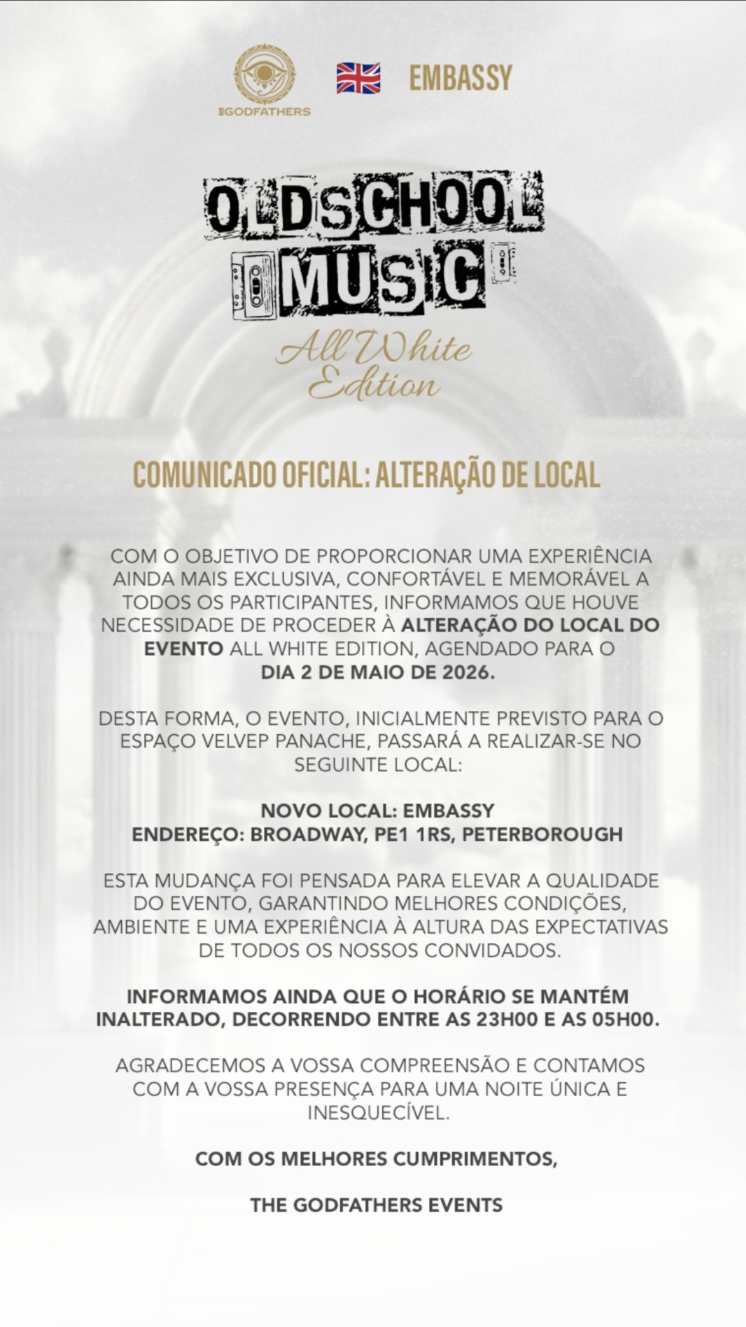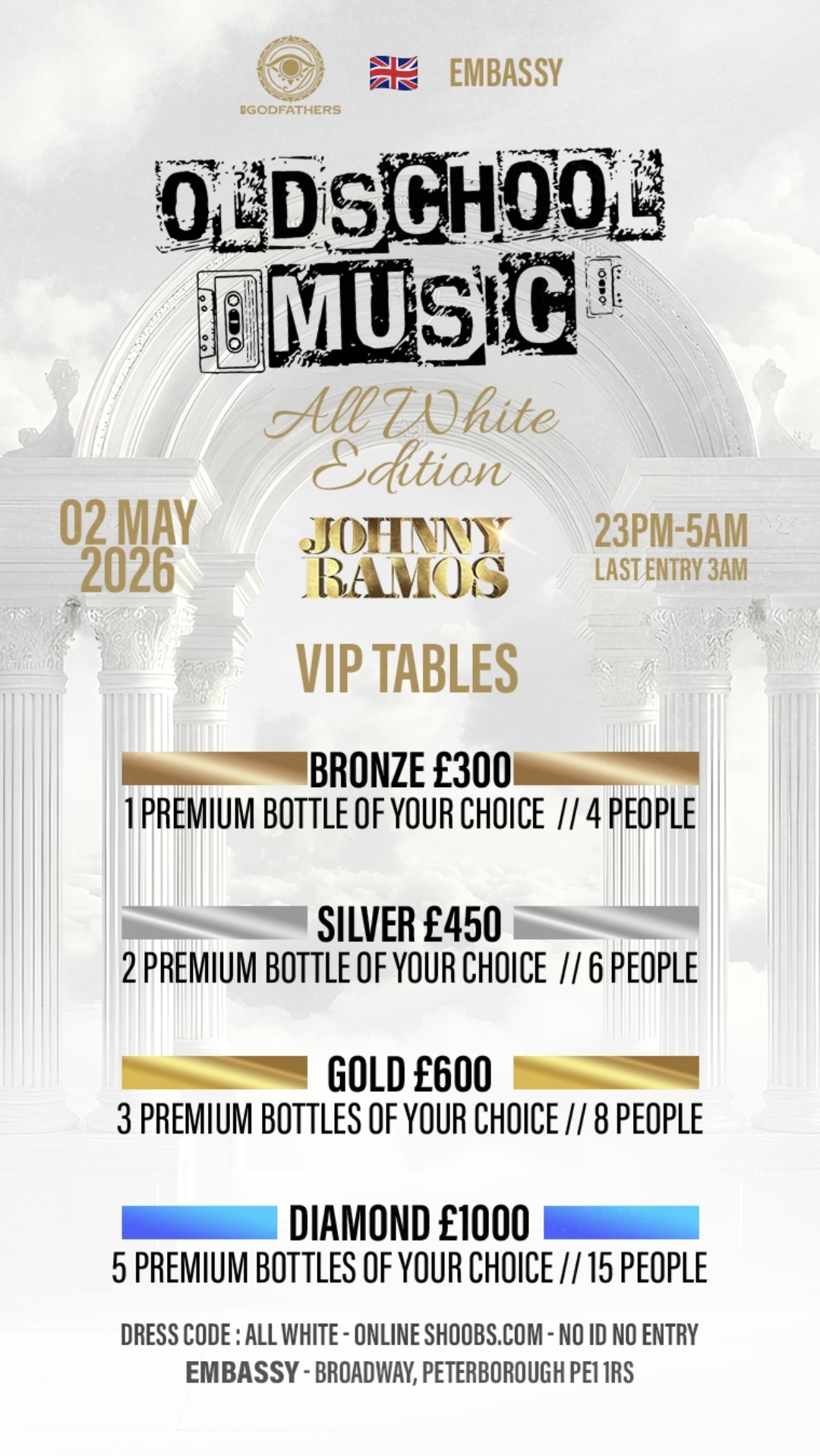 THEGODFATHERS APRESENTAM OLD SCHOOL MUSIC 📼 All WHITE EDITION 📆 02/05/ 2026 ( 23:00h - 05:00h ) LAST ENTRY 3AM 📍Embassy, Flares and Redroom, Broadway, PETERBOROUGH,...