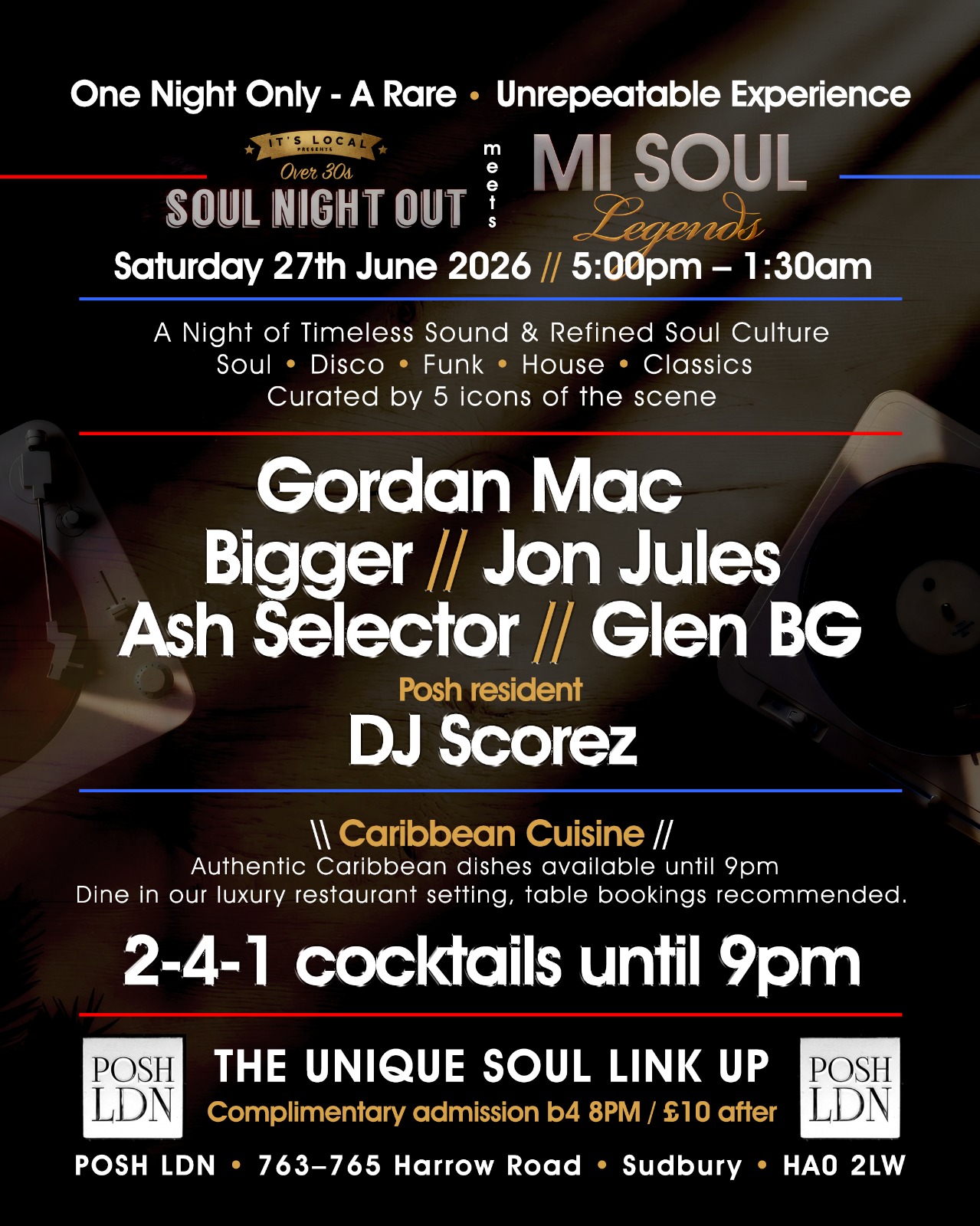 ✨ MI SOUL Legends x SOUL NIGHT OUT — The Luxury Edition ✨ A Night of Timeless Sound, Caribbean Flavour & Refined Soul Culture Saturday 27th June 2026 5pm – 1.30am POSH LDN 763–765 Harr...
