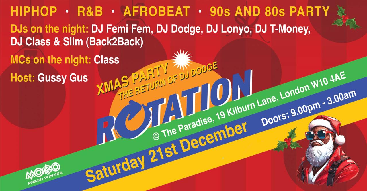 Saturday 2oth December It's time to grab your favourite crimbo dancing shows . The Mobo Award winning Rotation is back!! For this months big Christmas Special We will be spinning the hottes...