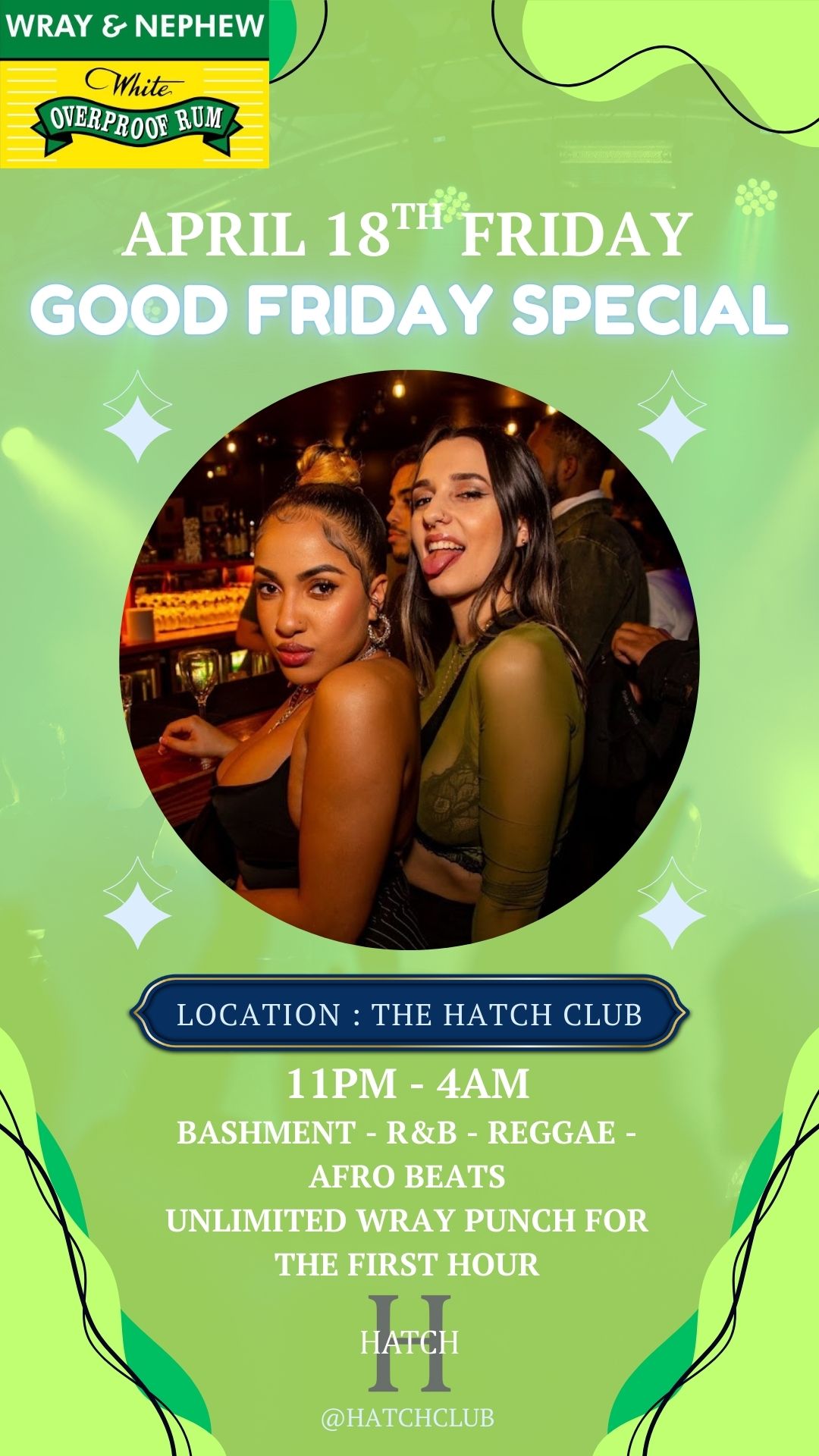 Start your Easter weekend the right way with the Good Friday Special at The Hatch Club — where the vibes are high and the Wray is flowing!