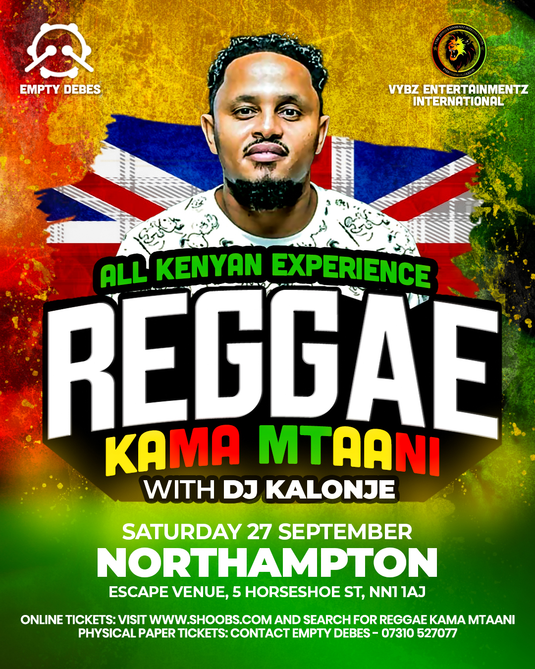 Empty Debes presents REGGAE KAMA MTAANI with Dj Kalonje Live in the UK. A massive celebration for Afro-Caribbian music just like home. Bring your Vuvuzela, whistles, Rasta wigs, Camouflage wear, Gideon Safari Boots or if you prefer Clarks. Lets paint the town with reggae and Kenyan flags.