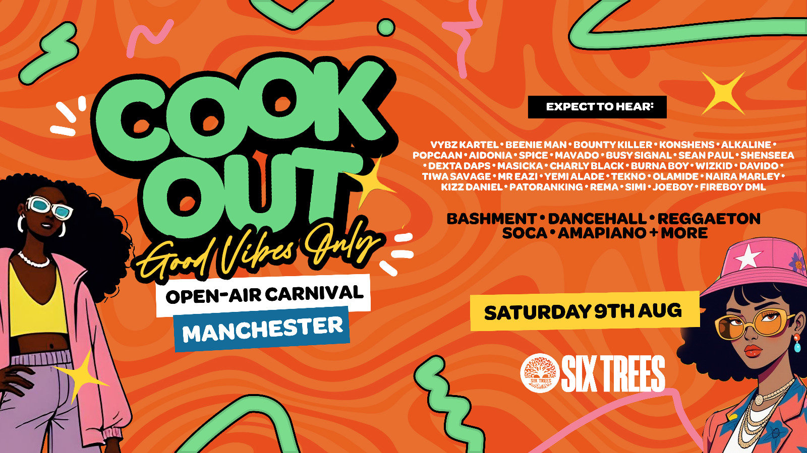 Join us as we take over the The Six Trees space in Manny as we shell it down with the best in Bashment, Dancehall, Reggaeton, Soca, Amapiano, and everything in between. Expect anon-stop soundtrack of carnival vibes and summer anthems from your favorite artists like Vybz Kartel, Popcaan, Spice, Burna Boy, Wizkid, Davido, Shenseea, Sean Paul, and more.