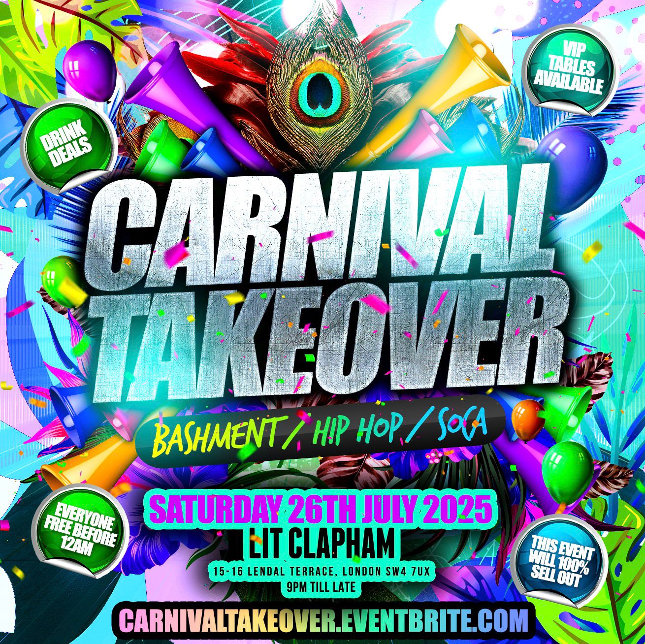 BASHMENT & AFROBEATS CLAPHAM CARNIVAL PARTY London’s Craziest Party Returns! Saturday 27th December 2025 Soul Lounge 76 Clapham High Street London SW4 7UL Music Policy: Bashment, Afro...