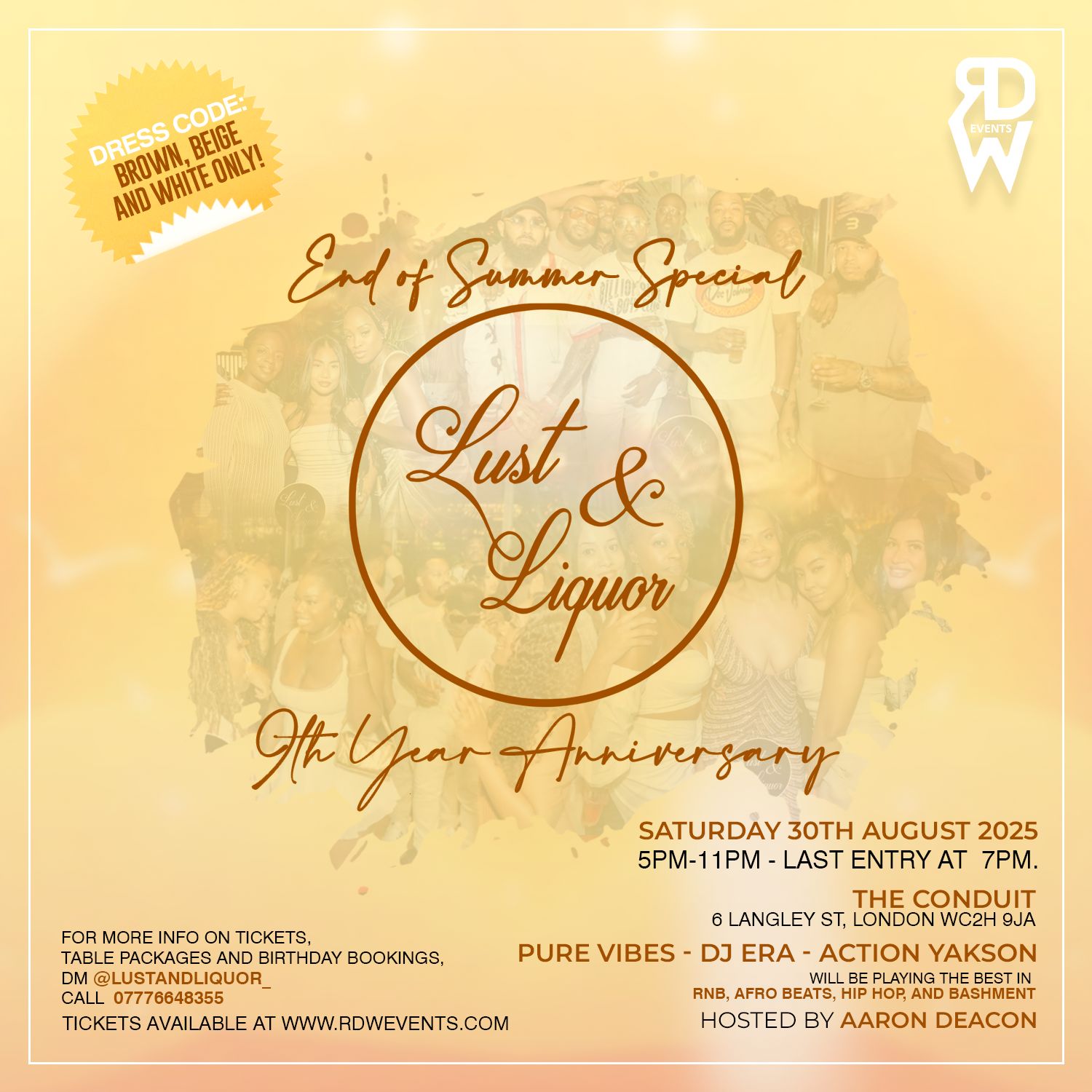Weβre back to close out the summer in style and celebrate 9 unforgettable years of Lust & Liquor! Expect premium vibes, beautiful people, and the very best in music all evening long. ππ½π₯
