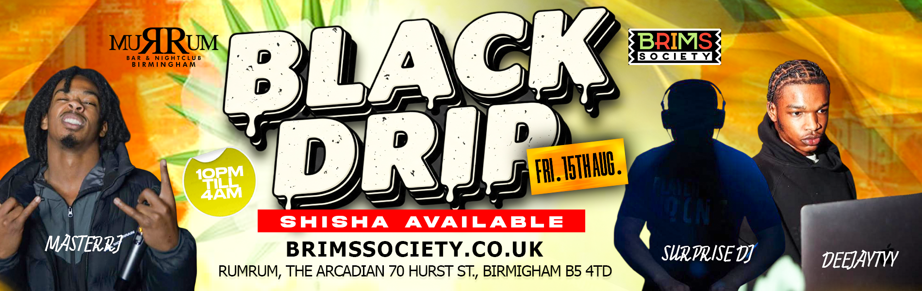 📅 Friday 15th August 🕙 10PM – 4AM 📍 Rum Rum, The Arcadian, Birmingham B5 4TD 🎧 On the decks: Master RJ, DeeJay Tyn + SURPRISE DJ bringing the best in: Hip Hop Dancehall Afrobeats Bashment & more! 💨 Shisha Available 🎟 Tickets on FATSOMA – brimssociety.co.uk Dress code: ALL BLACK 🖤 – come correct & photo ready 📸 #BlackDrip #BrimsSociety #RumRumBirmingham #AllBlackParty