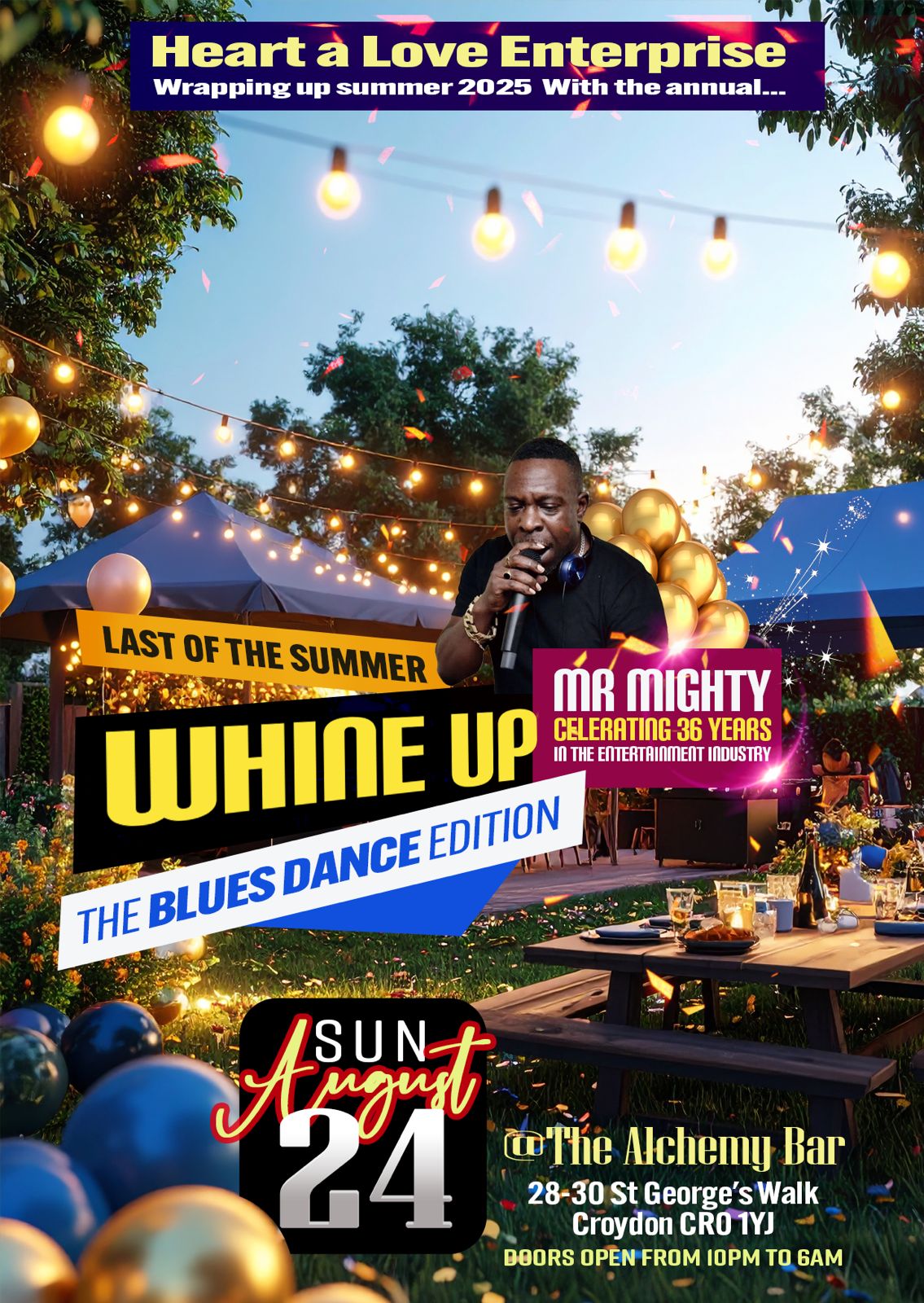 Heart a Love enterprise Wrapping up summer 2025 With the annual LAST OF THE SUMMER WHINE UP THE BLUES DANCE EDITION On Sunday 24th August 2025 @ The Alchemy Bar 28-30 St George's Walk Croydon CR0 1YJ Doors Open from 10pm to 6am This event is going to have a outside smoking area with BBQ & BAR ALSO SPEAKER'S Some of the best UK Djs Mr Mighty Watty Jnr Obe Chris vibes Buppy C Coco delight D-Mac And our very Special Guest from Birmingham Dj Capone