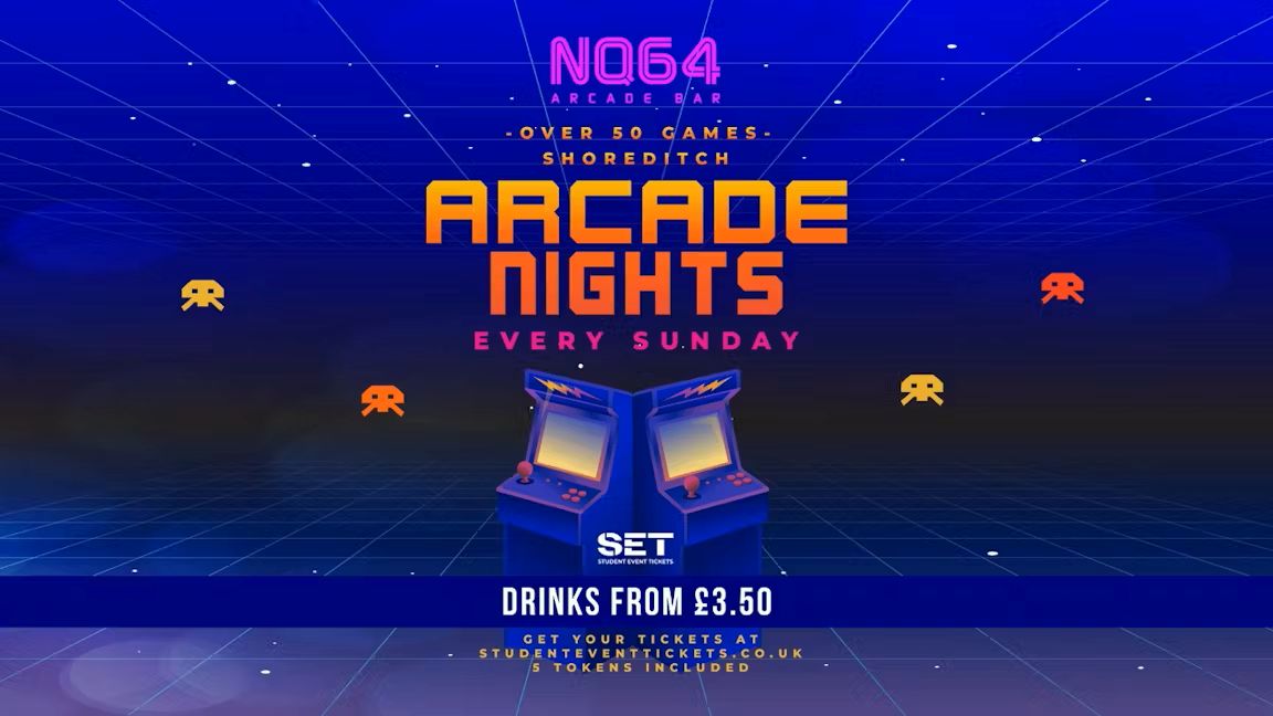 Arcade Night at NQ64 every Sunday ⭐️Grab your ticket now for our Arcade Nights at NQ64 Shoreditch! Each ticket includes 5 tokens for games on arrival, and student drink prices all night long from £3.50!🍹Over 50 arcade games to choose from in this underground Arcade bar 👀If you're a group or looking for a private booking - please contact us via the contact deails below and we can plan the perfect night out for you!