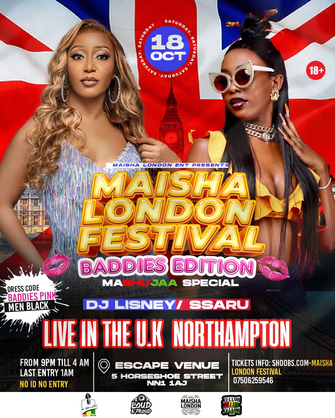 Ssaru Live & DJ Lisney - Maisha London Festival: Mashujaa Special -Baddies Edition. Kenya's queens are both headlining in the uk for the first time Ssaru live on stage-+ DJ Lisney on the decks bringing Nairobi's hottest vibes. A Mashujaa Day celebration of music, culture,people, fashion & baddie energy more than a party, it's a movement for the diaspora ft UK's top DJs and MCs all this powered by MC Yellow Yellow.