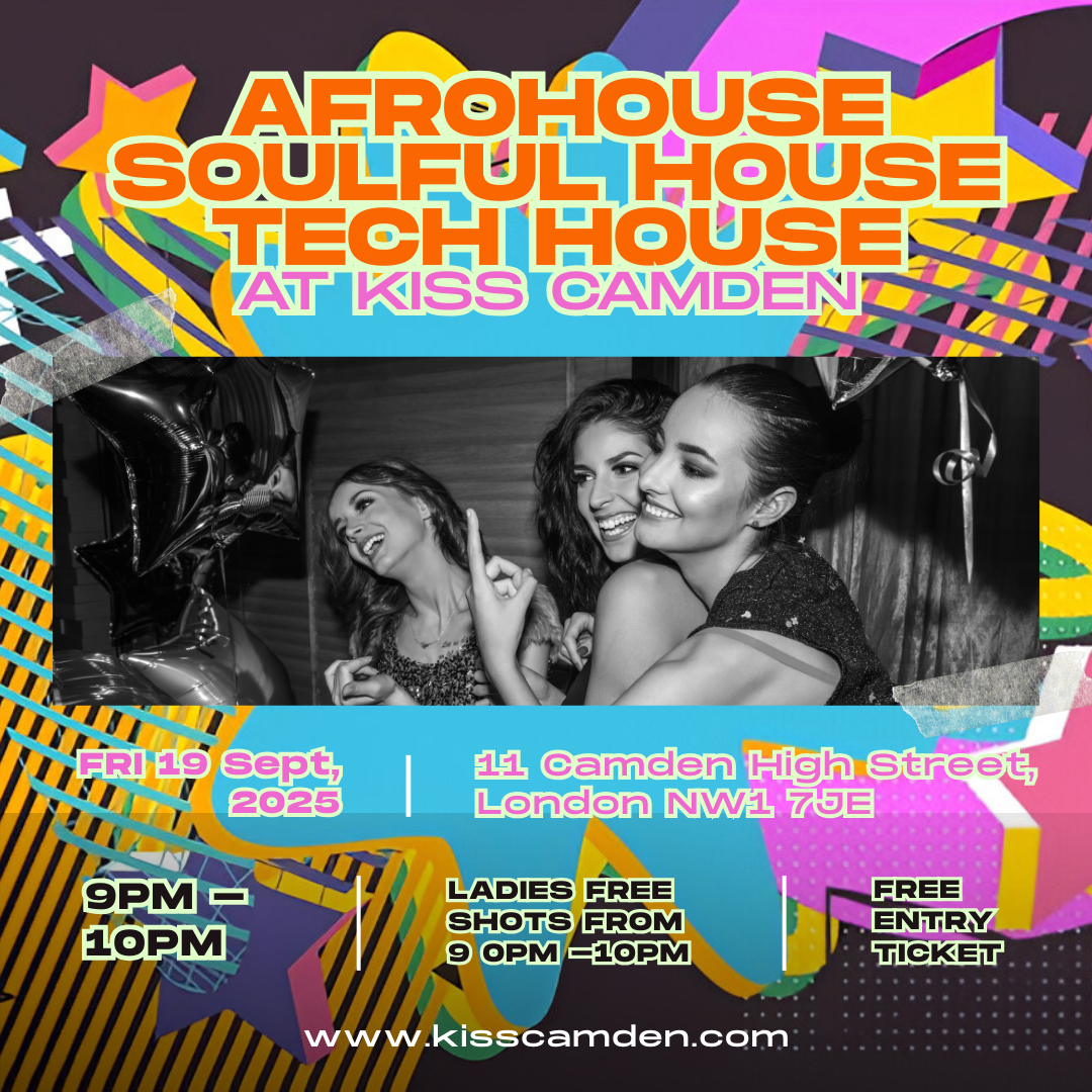 Kick off your weekend with a night of Afrohouse, Soulful House & Tech House at Kiss Camden on Friday 19 Sept 2025.