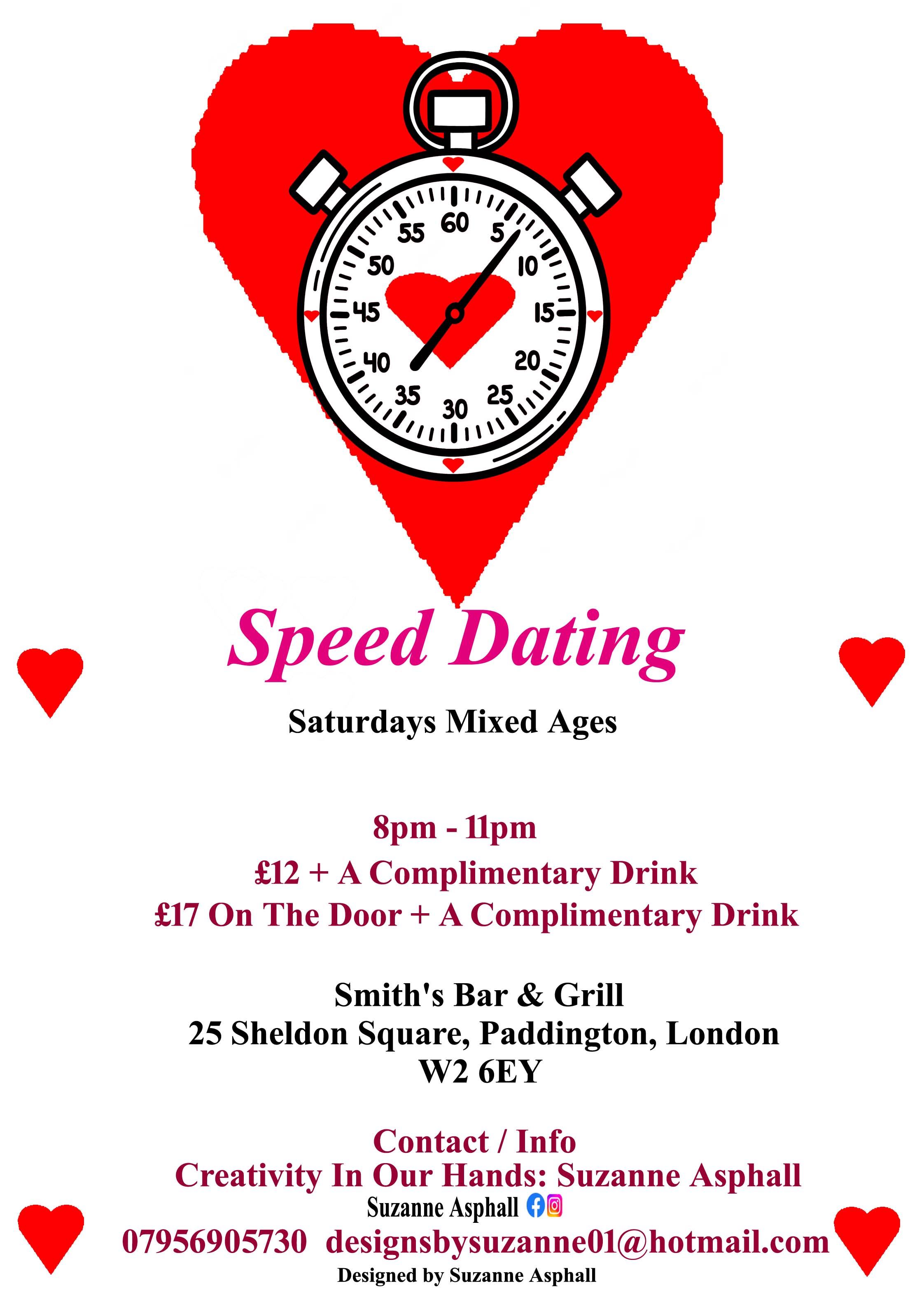 Speed Dating: It’s time for love. The experience, of meeting someone new, to form a connection. Taking place at Smith's Bar & Grill, 25 Sheldon Square, Paddington, London W2 6EY.