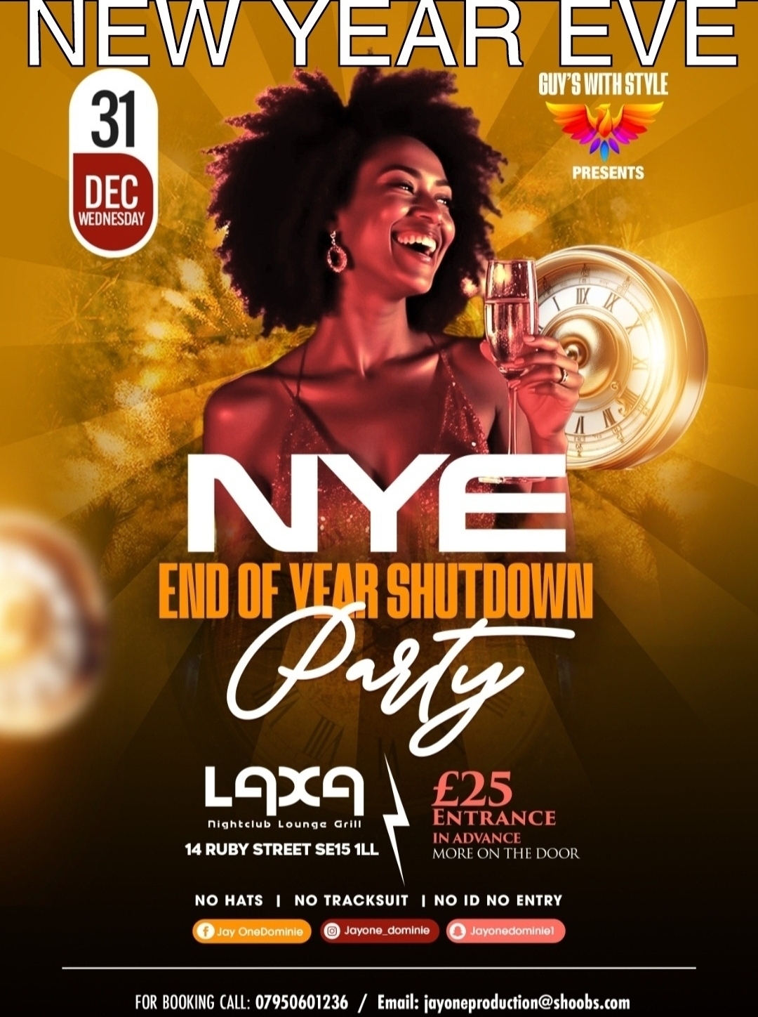 NEW YEAR EVE END OF YEAR SHUTDOWN PARTY.. Wednesday 31st December @LAXA NIGHT CLUB..14 RUBY STREET.. SE15 1LL.. Get Your Tickets In Advance Now.. Or More At The Door.. For Your Birthdays Or Vips Tables 07950 601236 Music 🎶 Amapiano/ AfroBeat/ Hiphop/ R&B/Bashment Djs On Rotation