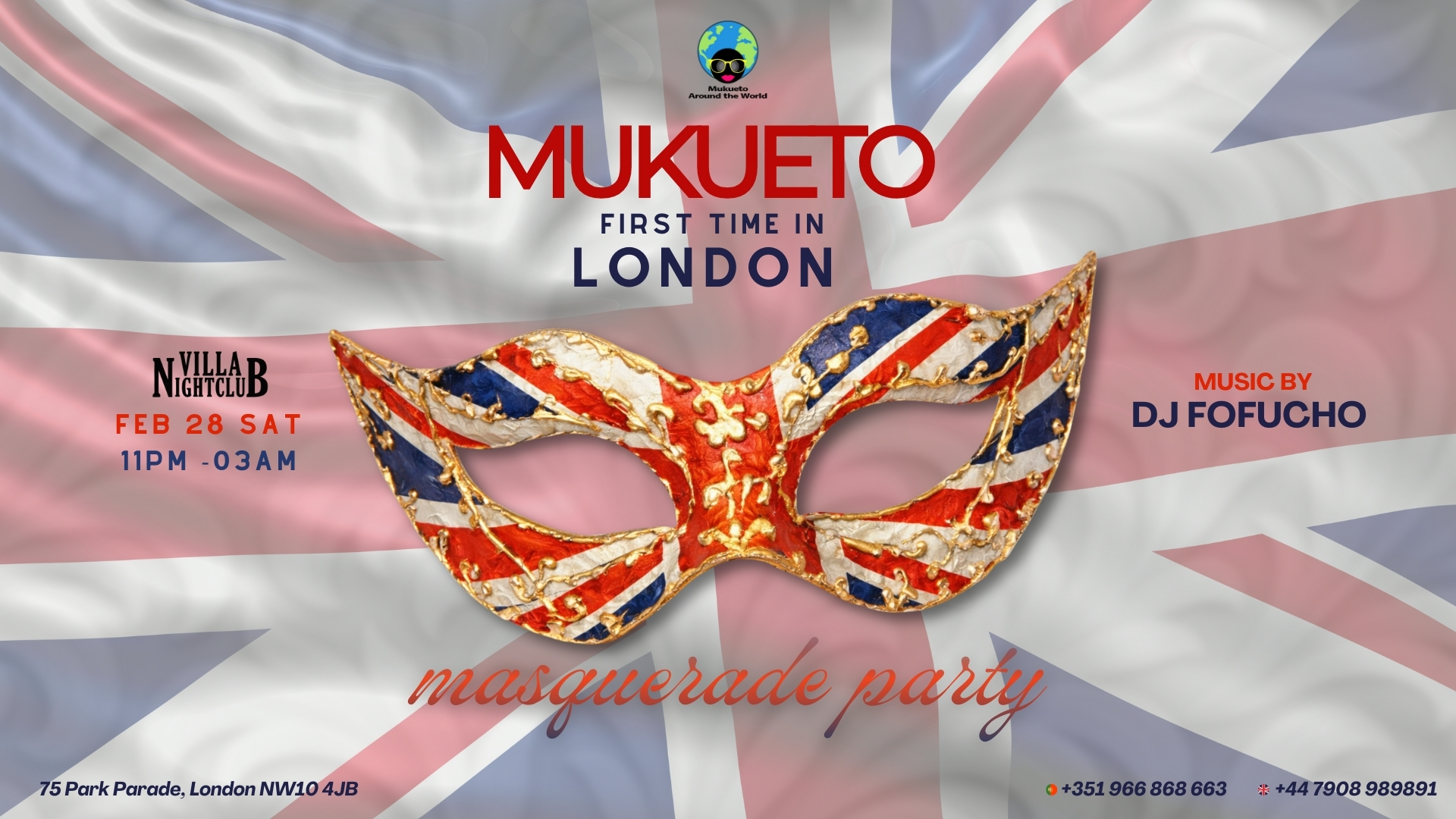 Mukueto, renowned for its legendary kizomba parties in Lisbon, is coming to London for the very first time. Join us on 28 February at Villa Night Club for the Mukueto Masquerade Party, an unforgettable night of rhythm, elegance and dance. The party runs from 11pm to 3am — don’t miss this exclusive debut in the UK.