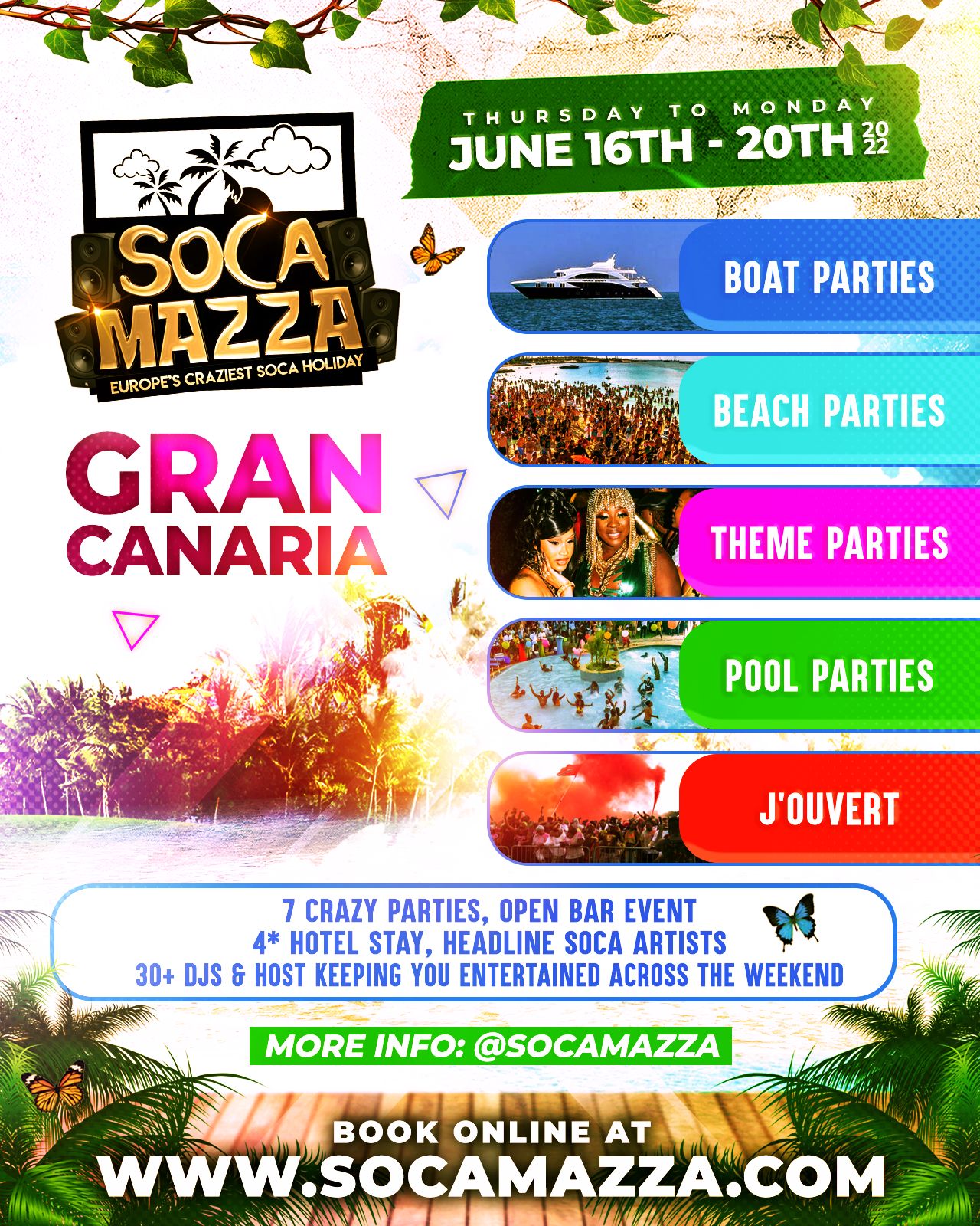 After 2 sold out events in Amsterdam, Soca Mazza heads to the beautiful islands of Gran Canaria for 4 crazy days & nights of sun, fun & non-stop partying. We have a selection of the best Soca Artists & DJs to keep you entertained over this fun-packed holiday. Book now and get ready for SOCA MAZZA 2021.