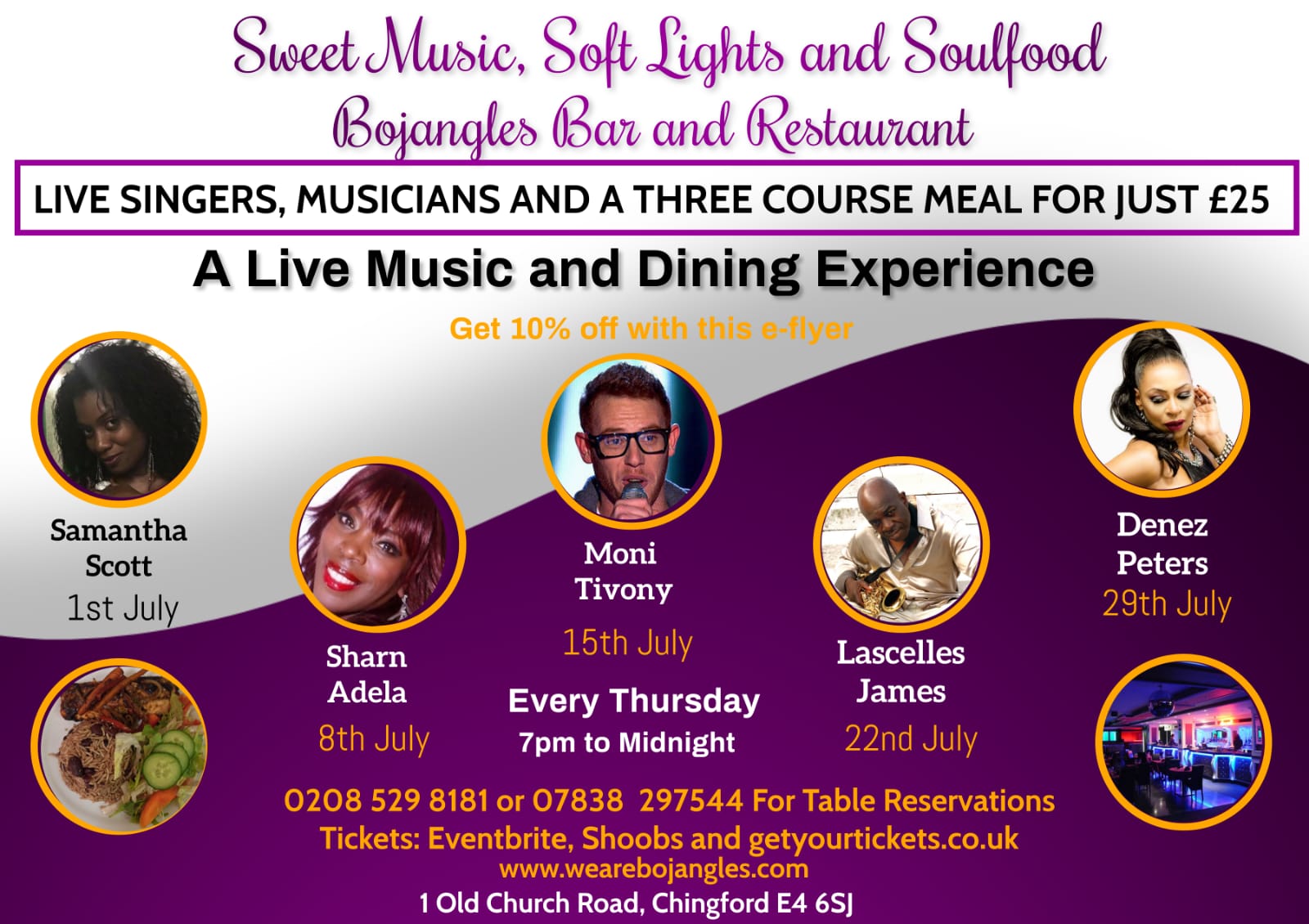Bojangles presents an exclusive dining experience in Chingford with live music this July. Enjoy a three course meal accompanied by the sweetest voices at one of the best nights in Chingford.