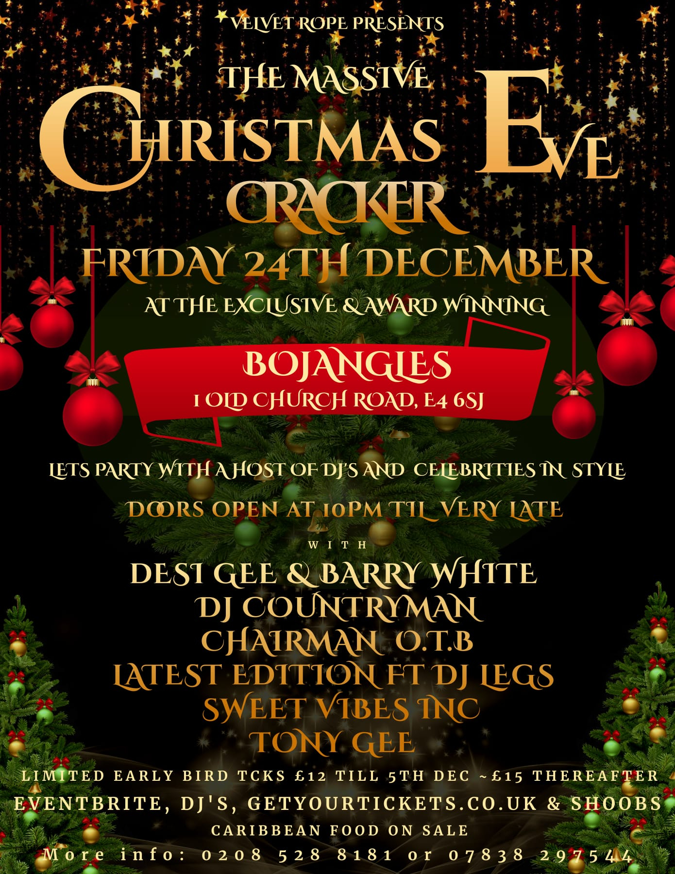 This Christmas Eve Bojangles together with Velvet Rope Productions presents the biggest Christmas Party in Chingford. The Massive Christmas Eve Cracker will feature the best music, and the best crowd in Chingford to guarantee an unforgettable Christmas Eve. Leave behind all of your worries this December the 24th and head on over to Bojangles for a night filled with cups of cheer, mistletoe, the finest eggnogs and the best turkey in town. Our doors open at 10PM for only 12pounds per person (early birds; 15 thereafter) and stay open all night long.