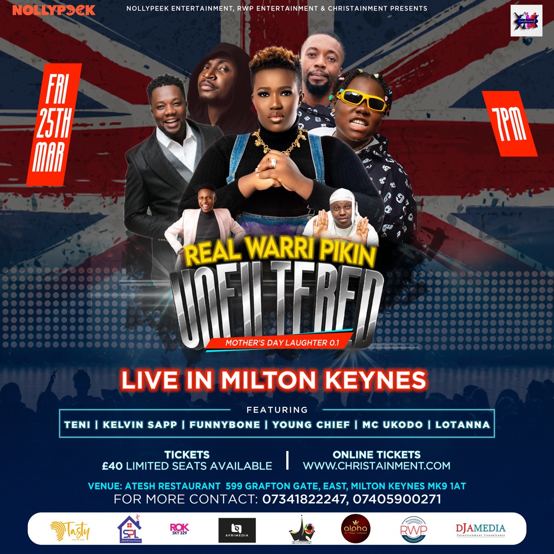Mother’s Day comedy and Music by Nigeria’s female combo with Real Warri Pikin, and live music by Teni. Makanaki. This combo is one that hasn’t been seen before and promises to be a great night . All lovers of mothers are welcomed. Also featuring Funnybone, Kelvin Sapp, Young chief, Mc aikido and Lotanna.