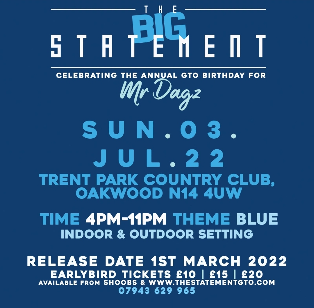 The Summer Blue Day Party celebrating the birthday for Mr Dagz. Just like 4 years ago at Trent Park, we return with the mentality of if its not broken don't fix it. Get your tickets early as this one is tipped to beat the last one, it will sell out!!! So move fast