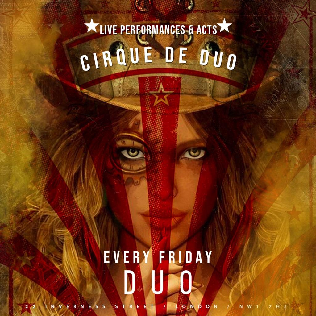 Cirque de DUO More than just a party, our weird and wonderful circus acts perform throughout the night and shape your evening to anything our imagination can conceive! 15mins of Entertaining performances take place 3 times every Friday from balancing act to contortionists, the acts combine to create a truly Cirque experience