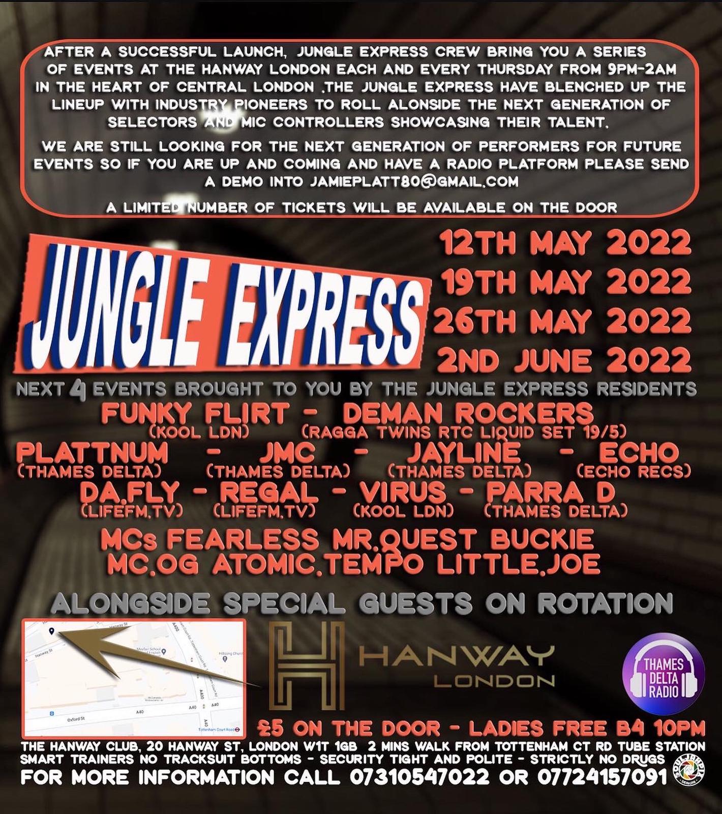 All aboard the Jungle Epress with DJs om rotation taking you through the best of Jungle with a touch of Drum and bass.