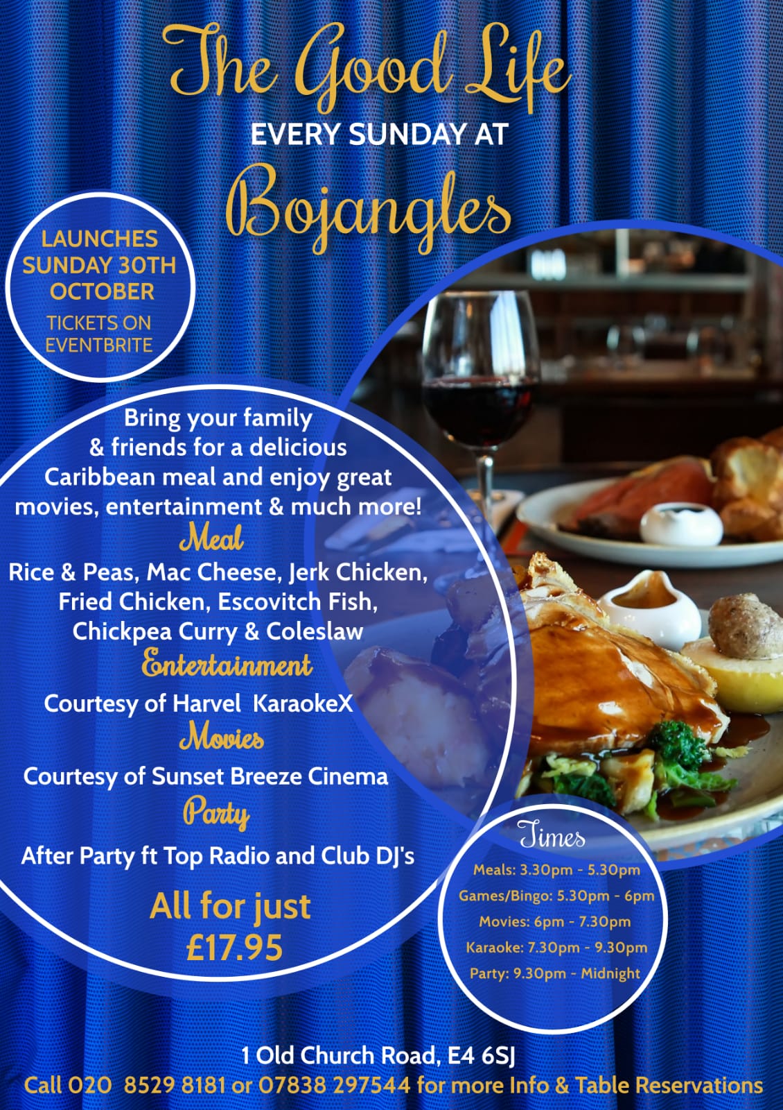 Loving the Good Life at Bojangles presents a truly wonderful experience of meals, movies, and music. Head on over to Chingford with your family, friends, and colleagues this Sunday for a memorable weekend featuring a delicious Caribbean meal, a movie, live comedy, quizzes and so much more.