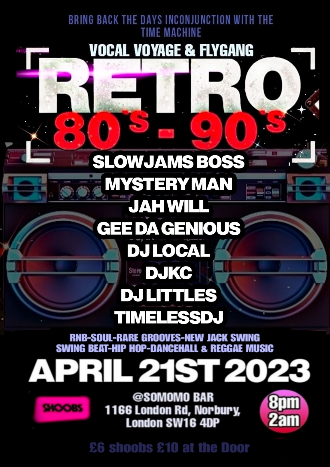 Tickets £6 From https://shoobs.com/events/80833/80s-90s-retro-rnb-dancehall-soul-music-party