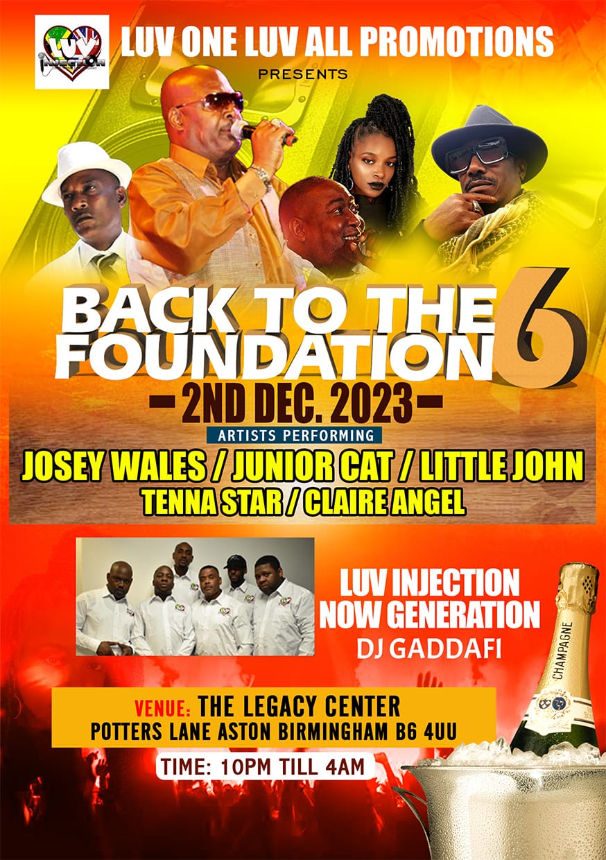 A night of original 80s and 90s revive music with specially selected artists Josey Wales Junior Cat , Little John ,Clair Angel and Tenna Star. To bring you back in time luv injection in the house giving you that clarity and quality in sound and music along with Now Generation sound and the Original DJ Gaddafi