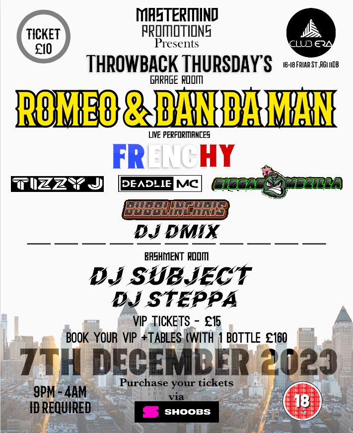 Join us at Throwback Thursdays, the ultimate club night experience in Reading! Get ready for a night packed with non-stop fun, where we'll be bringing you the best of Bashment and Garage bangers. Taking place at the incredible Club Era, this event is set to be one for the books.